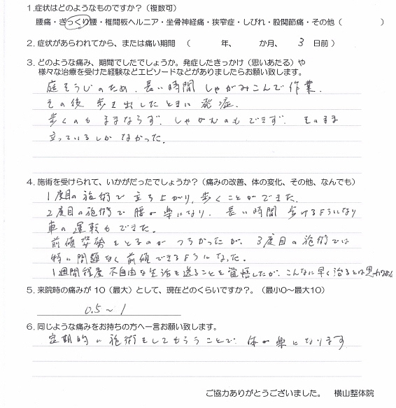 痛い期間2日前 朝起床時にぎっくり腰に。初回の施術翌日に楽になり、公園に1日居ても大丈夫に。次回来院の際に昨日からコルセットをはずしている。合計3回来院していただき終了。 |