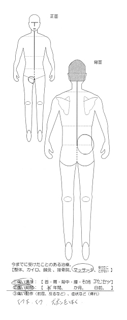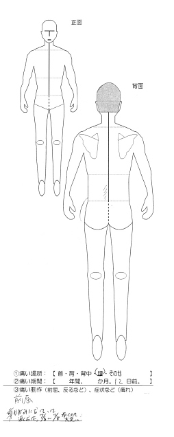 痛い期間1日前 姿勢を変えるときが痛い。初回の施術後は、効果をあまり感じていなかったらしいですが、翌日から楽になっていただき、5回目以降から首や肩も施術をしながらメンテナンス状態に。 |