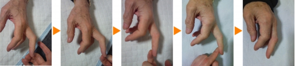 10年以上、指が曲がったまま少ししか動かせない状態。施術後、指の動かせる範囲が広がり、痛みも改善。